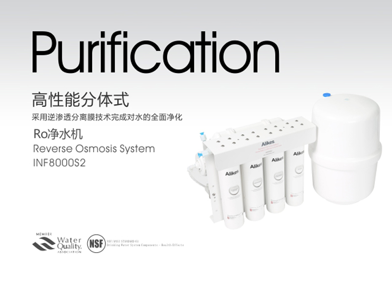 Alikes RO凈水機(jī)是對市政自來水或可以飲用的地下水進(jìn)行二次深度凈化處理的終端水處理設(shè)備,出水品質(zhì)符合衛(wèi)生部《生活飲用水水質(zhì)衛(wèi)生規(guī)范》(2001)的規(guī)定。凈水機(jī)應(yīng)用了******進(jìn)的逆滲透分離膜的技術(shù),依靠增壓泵對原水施加壓力,使原水透過逆滲透膜,把原水中細(xì)微雜質(zhì)、過多的無機(jī)鹽、有機(jī)物、重金屬離子、******、病毒、農(nóng)藥、三氯甲烷致癌物等有害物質(zhì)截留,并通過連續(xù)排放的濃水出口(污水排放口)將這些水中有害異物排出。進(jìn)而完成對水質(zhì)的******凈化。