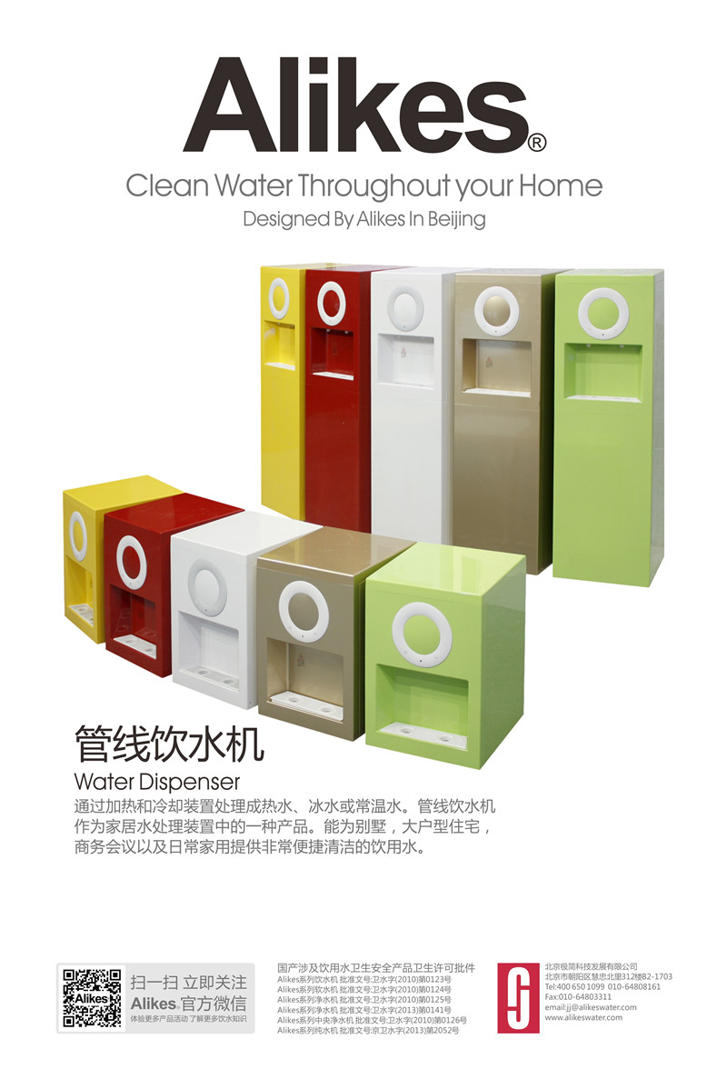 Alikes管線機(jī)可配合終端凈水機(jī)使用,也可以利用自帶的濾芯(選配)進(jìn)行水處理凈化。凈化后的水經(jīng)PE輸水管連接到機(jī)內(nèi)的密閉儲(chǔ)水罐,通過(guò)加熱和冷卻裝置處理成熱水、冰水或常溫水。管線飲水機(jī)作為家居水處理裝置中的一種產(chǎn)品,能為別墅、大戶型住宅、商務(wù)會(huì)議以及日常家用提供非常便捷清潔的飲用水。